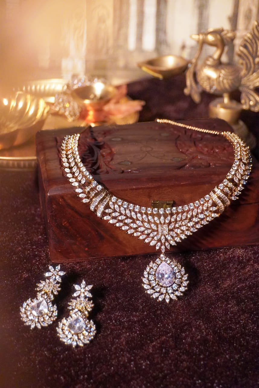 Royal floral diamond-style jewellery set. Make a grand entrance with this exquisite choker and earring set. featuring a stunning floral leaf design, this set is meticulously crafted with shimmering brilliant-cut stones to capture light from every angler